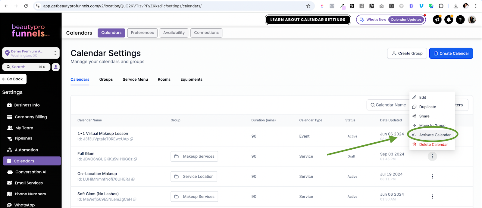 3. From the menu, click "Activate Calendar"